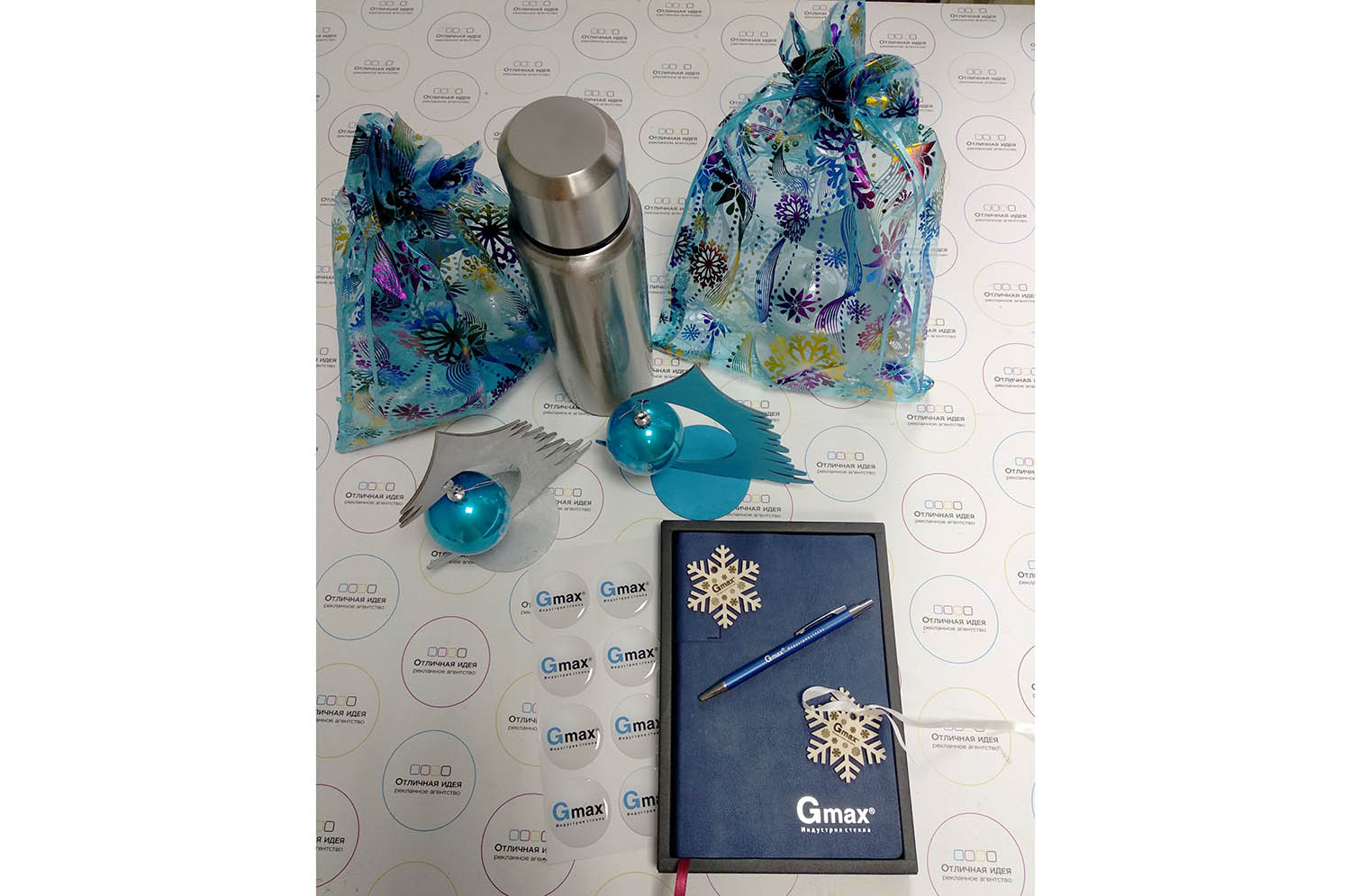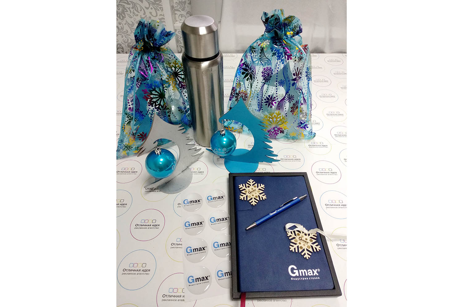 Новогодние подарки компании Gmax: термос, ежедневник, ручка с логотипом компании и сувенирная, деревянная ёлочка с шариком, на котором так же бренд компании.