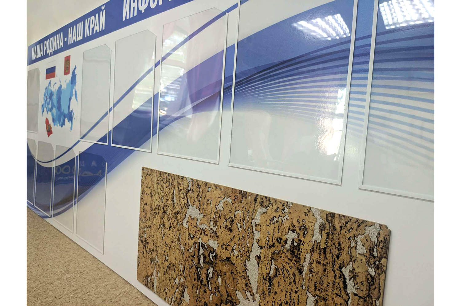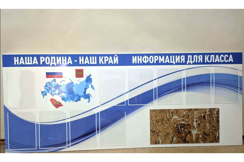 Стенд предназначенный для размещения информации. На нём расположены 10 кармашков в которые вставляются листы А4 формата, также есть пробковый лоскут на котором можно крепить листы различных форматов с помощью кнопок.