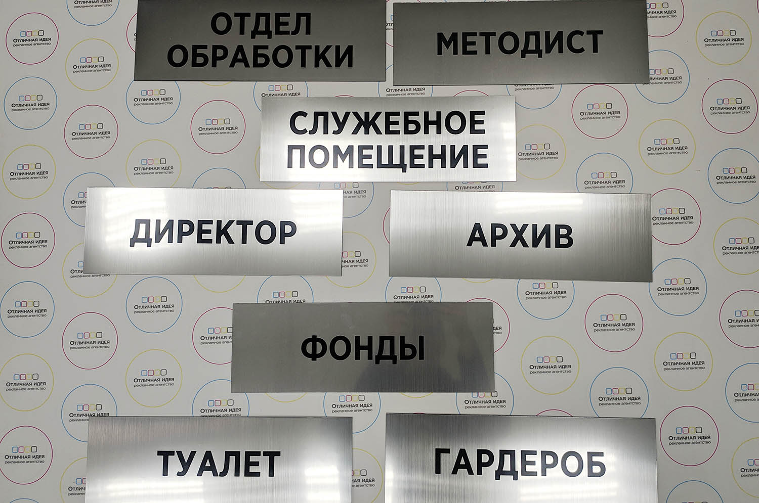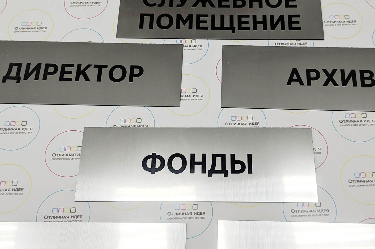 Таблички сделаны из серебренного пластика, буквы сделаны с помощью лазерной гравировки. Такие таблички необходимый атрибут для удобного перемещения и поиска.Описание