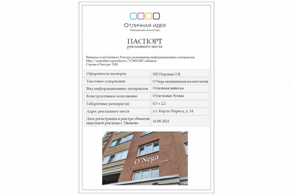 • Паспорт рекламного места (вывески) для компании O'Nega