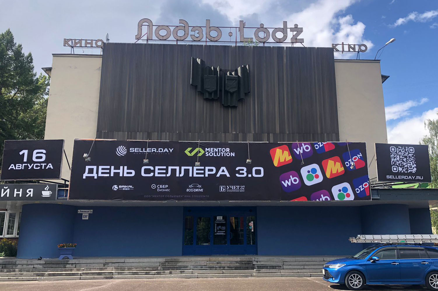 Рекламные банеры для мероприятия "День селлера" изготовлены на деревянном каркасе и смонтированы бригадой наших специалистов. Габарит центрального банера 14,6×3 м, банеры слева и справа имеют размер 2х3м, разрешение печати 720 lpi, плотность материала 440 гр/кв. м.