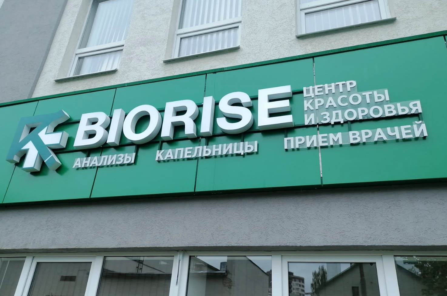 Вывеска выполнена в виде световых букв на металлокаркасе. Боковая стенка — не световая, лицевая часть буквы — матовое акриловой стекло