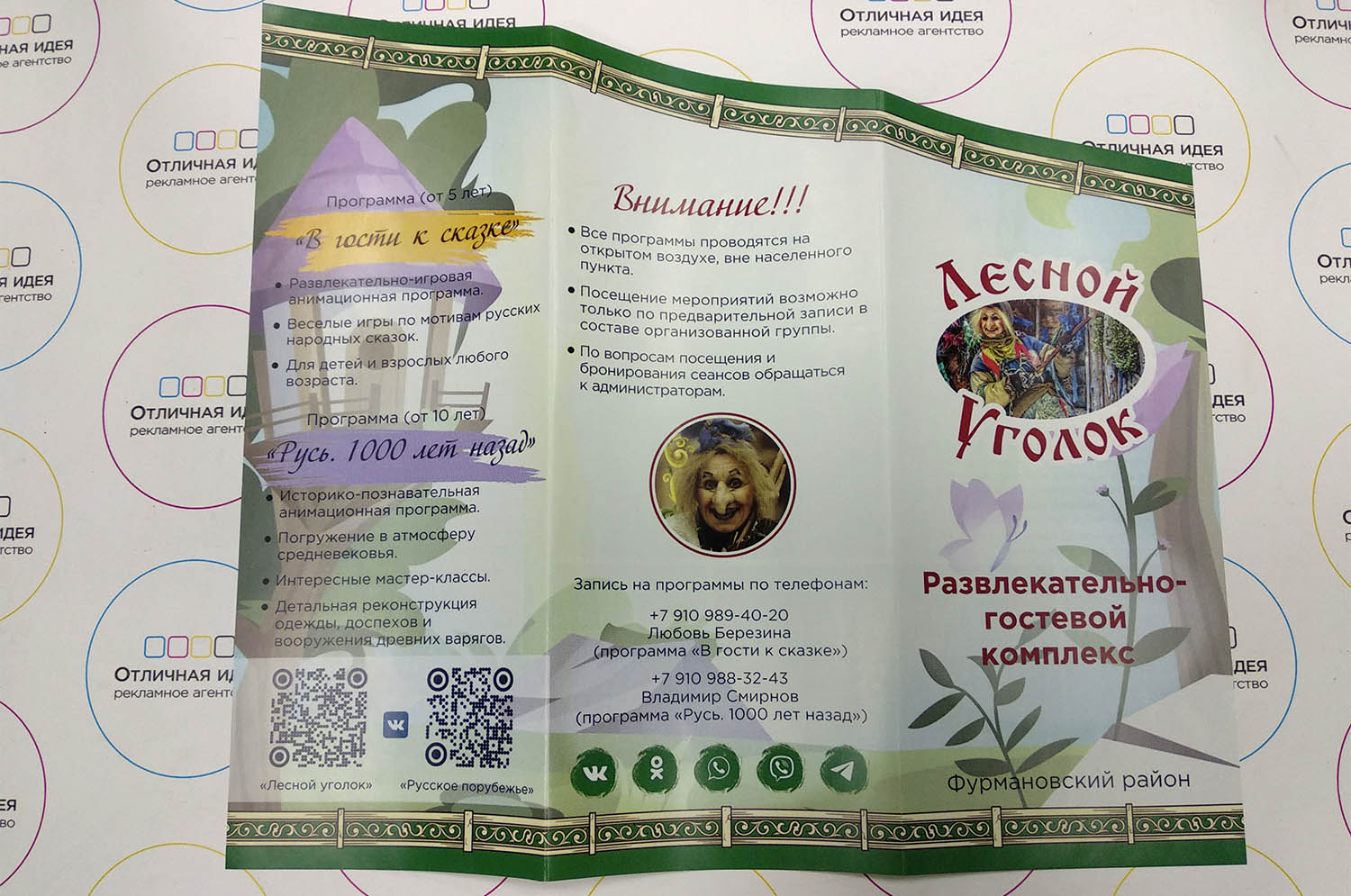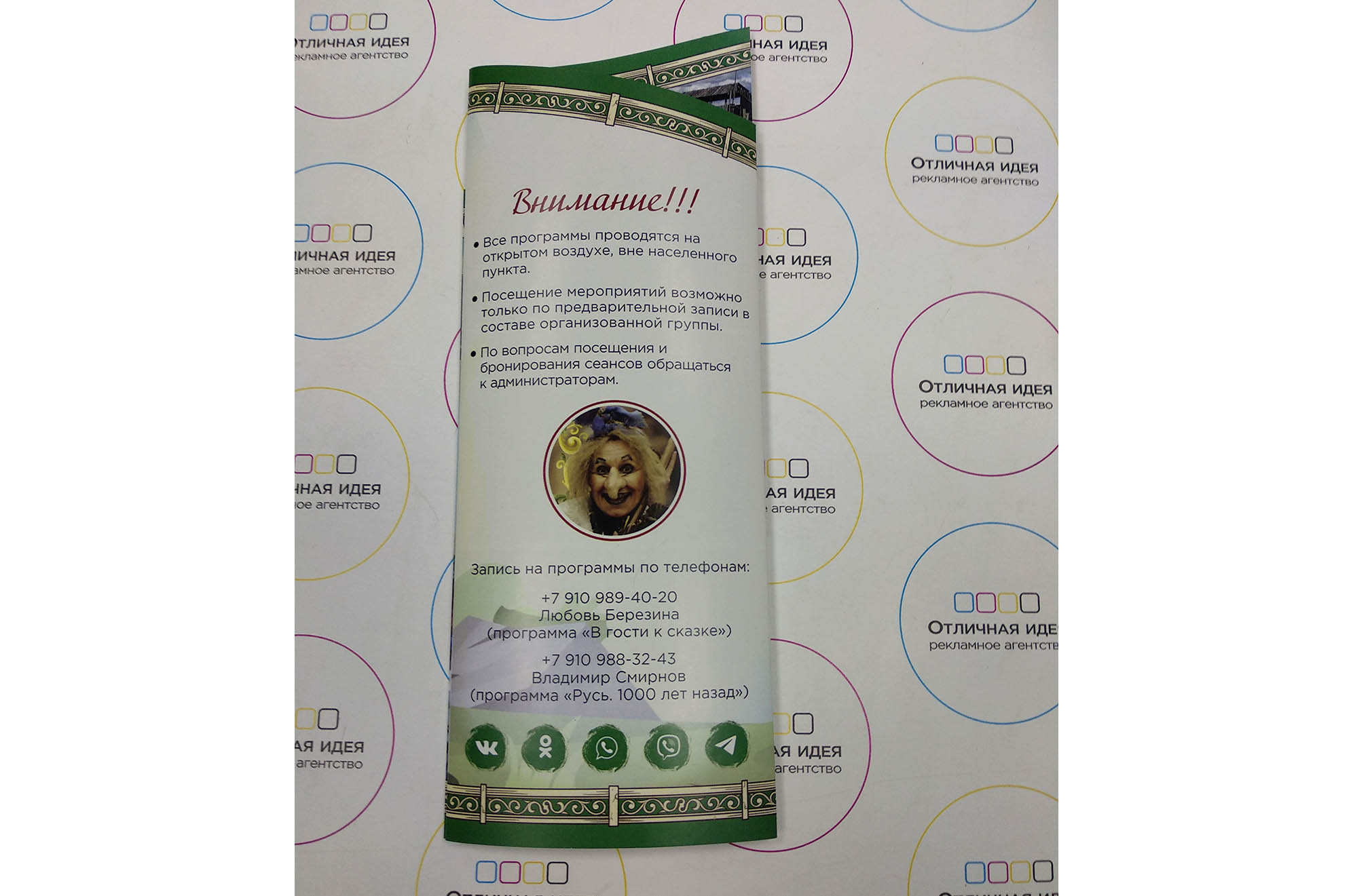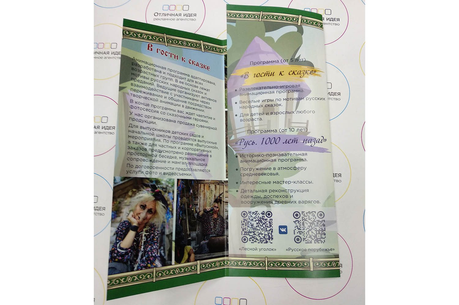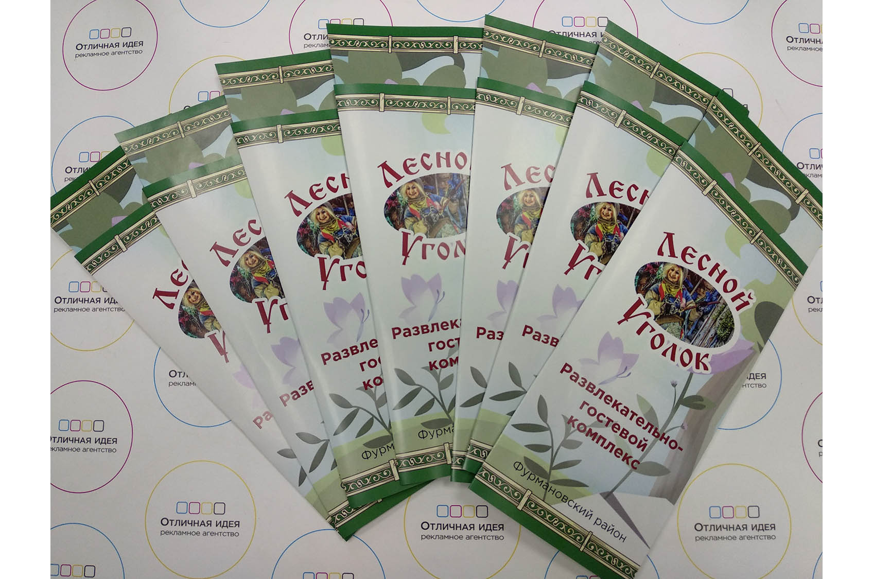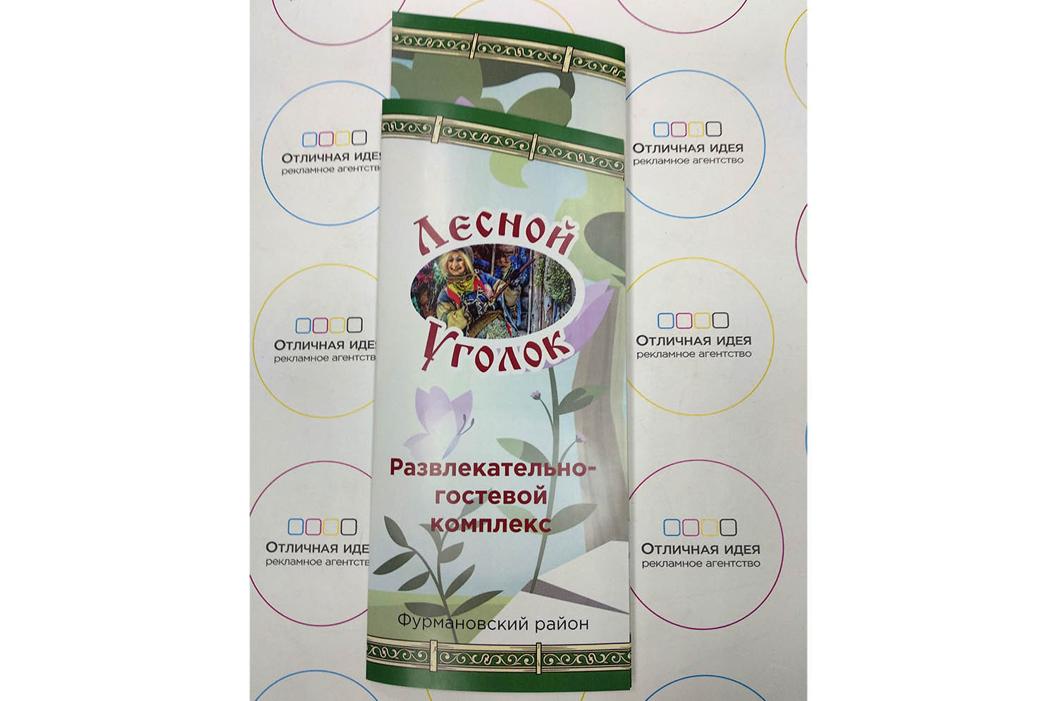 Буклет необычной формы на два разворота.Букле́т (англ. booklet — «книжечка») — издание в виде одного листа печатного материала, сфальцованного любым способом в два или более сгибов. Традиционно буклеты изготавливаются на бумаге из листа формата А4.