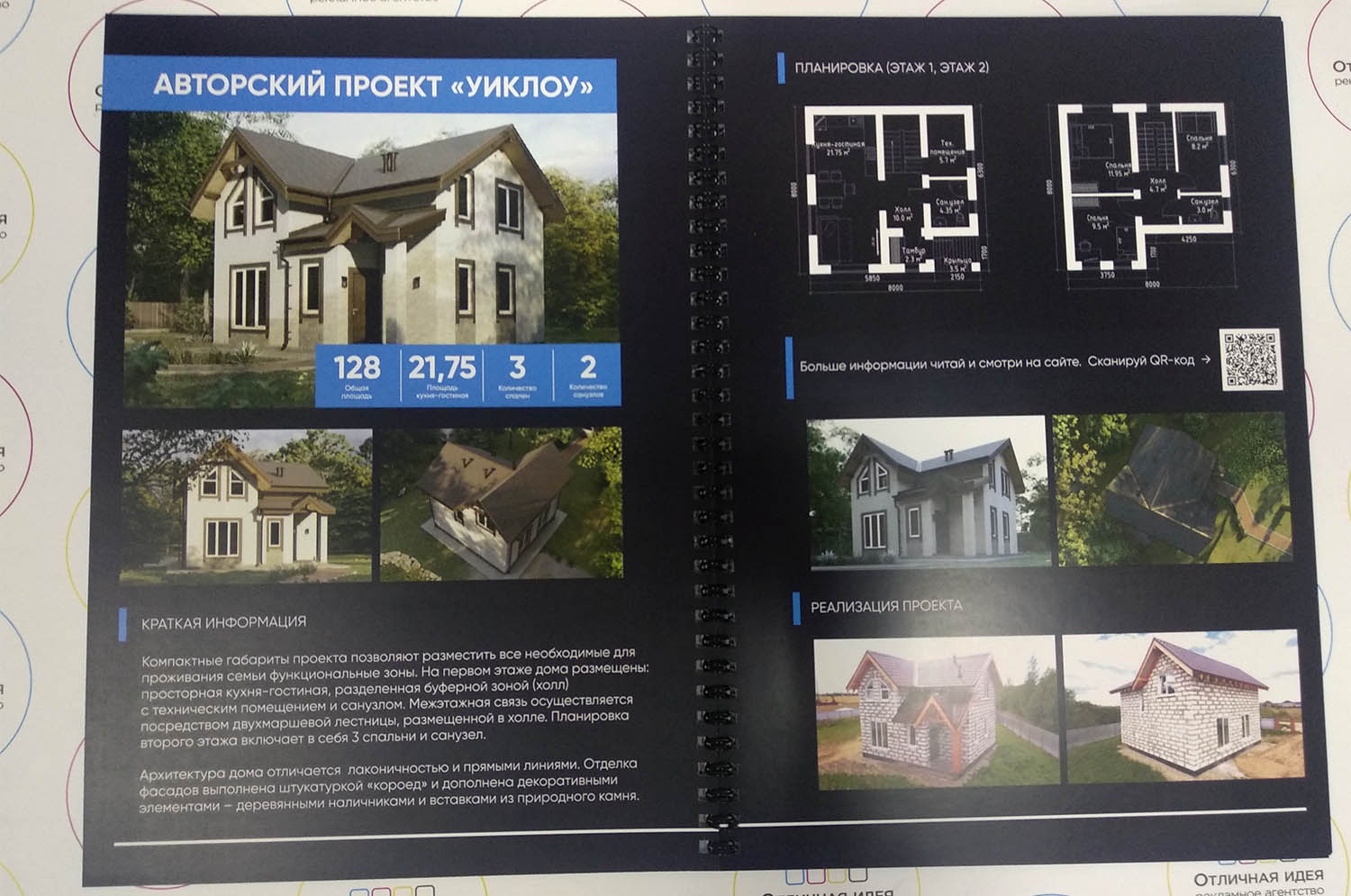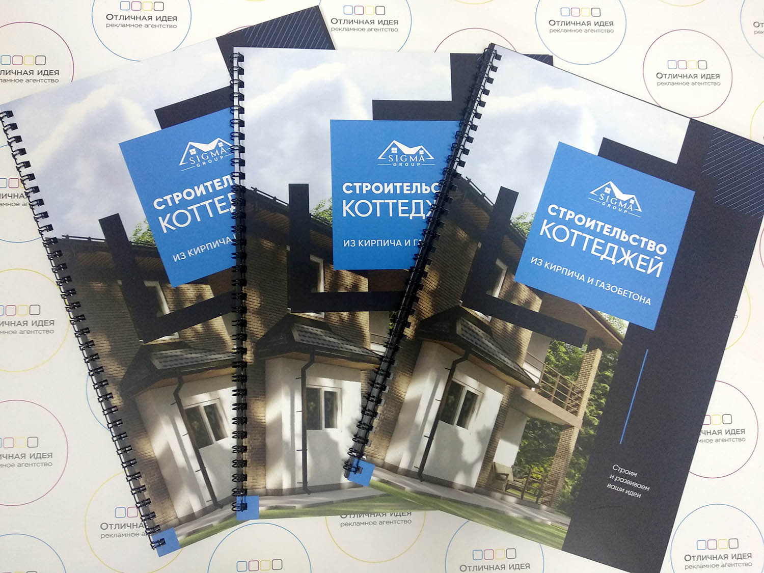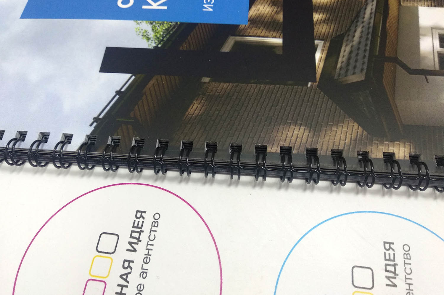 Каталог А5 формата, сделанный из очень плотного картона с матовым покрытием, на пружине.|
