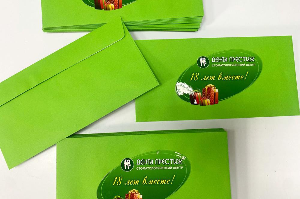 К 18-летию компании "Дента Престиж" нами были подготовлены фирменные конверты - в цветах брендбука. Наклейки выполнены методом УФ/ДТФ печати.