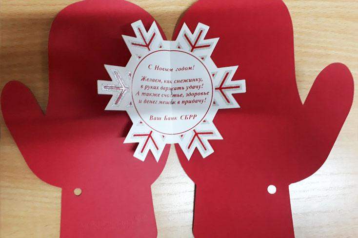 Данная новогодняя открытка является хитом продаж в новогодние праздники - ведь всем приятно открыв ладошки получить поздравление с тёплыми словами, даже если они напечатаны на снежинке!