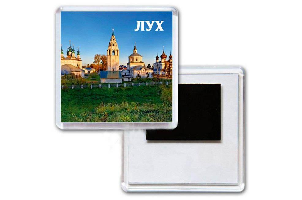 Технология изготовления: разработка макета с видами и достопримечательностями п. Лух. Цифровая печать по макету, ручная сборка магнитов в заготовку из акрила размером 6,5 х 6,5 см.