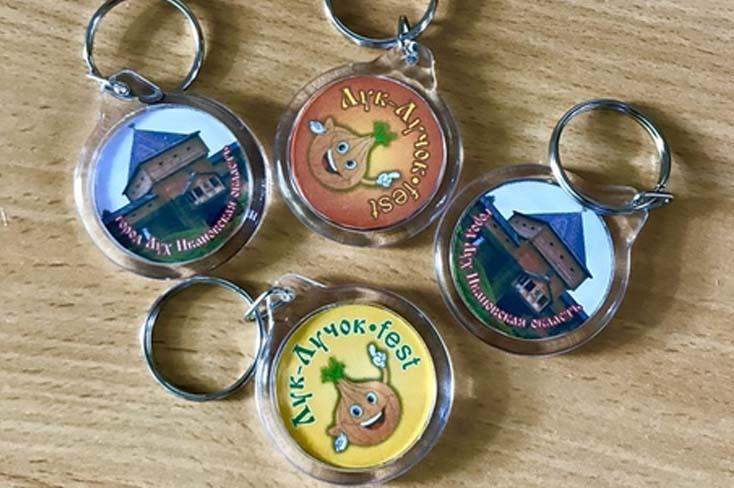 Для оперативного изготовления брелоков мы используем акриловые заготовки. Это круглые брелоки из прозрачного оргстекла, куда вставляется полноцветная печать.