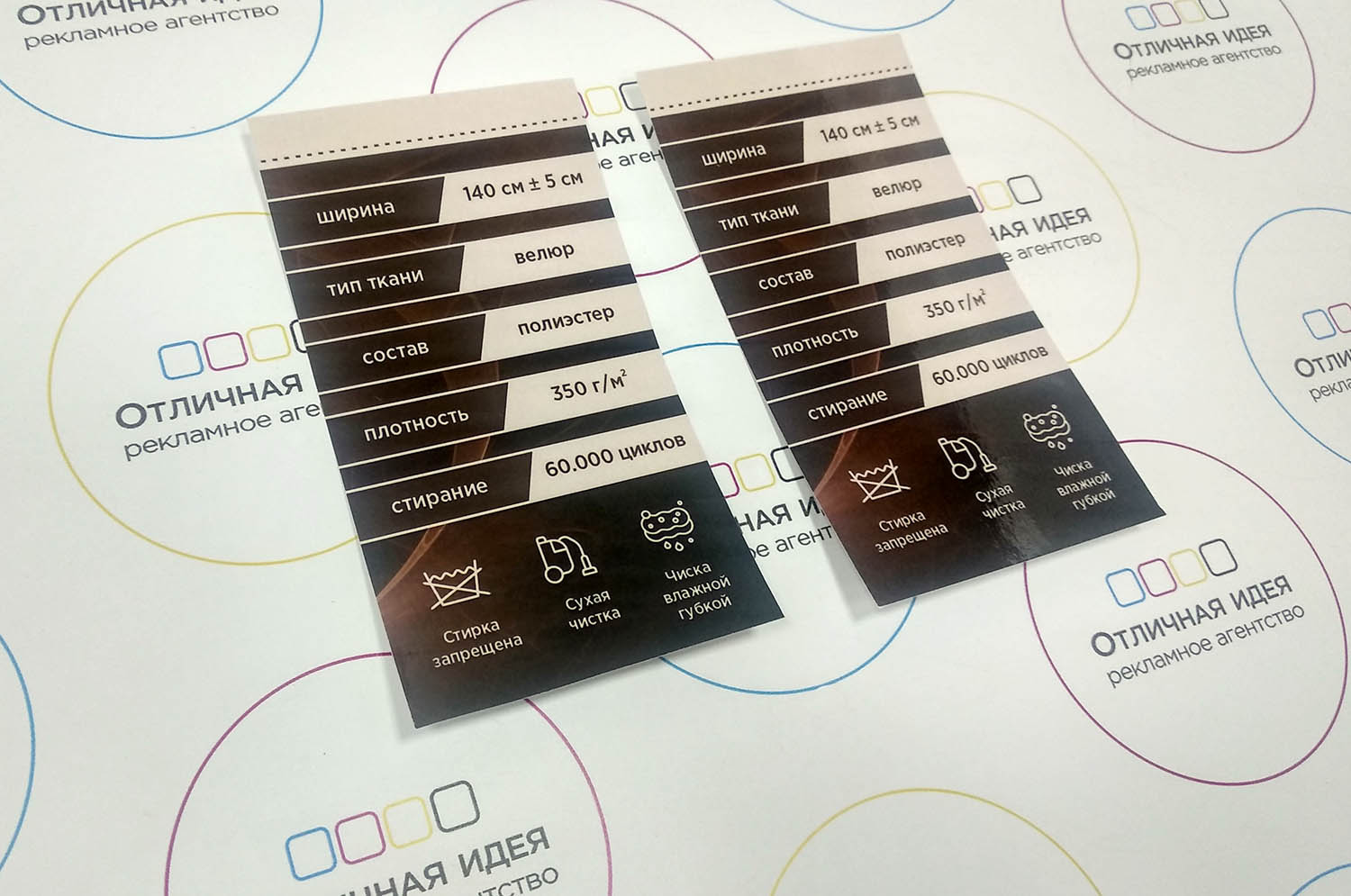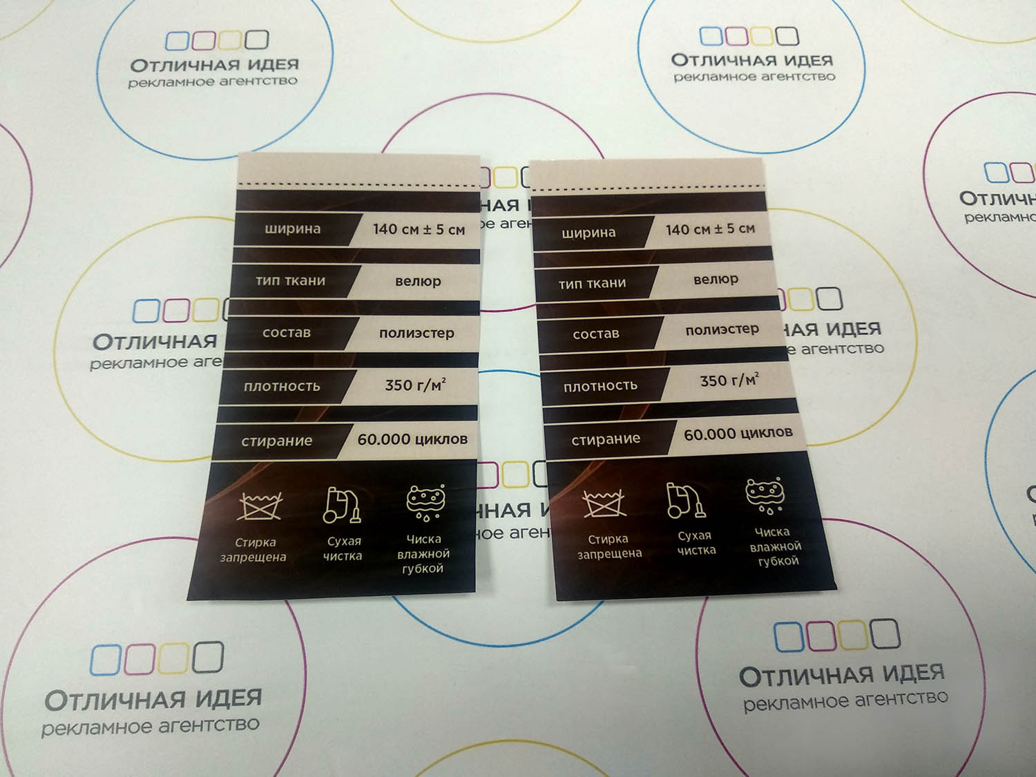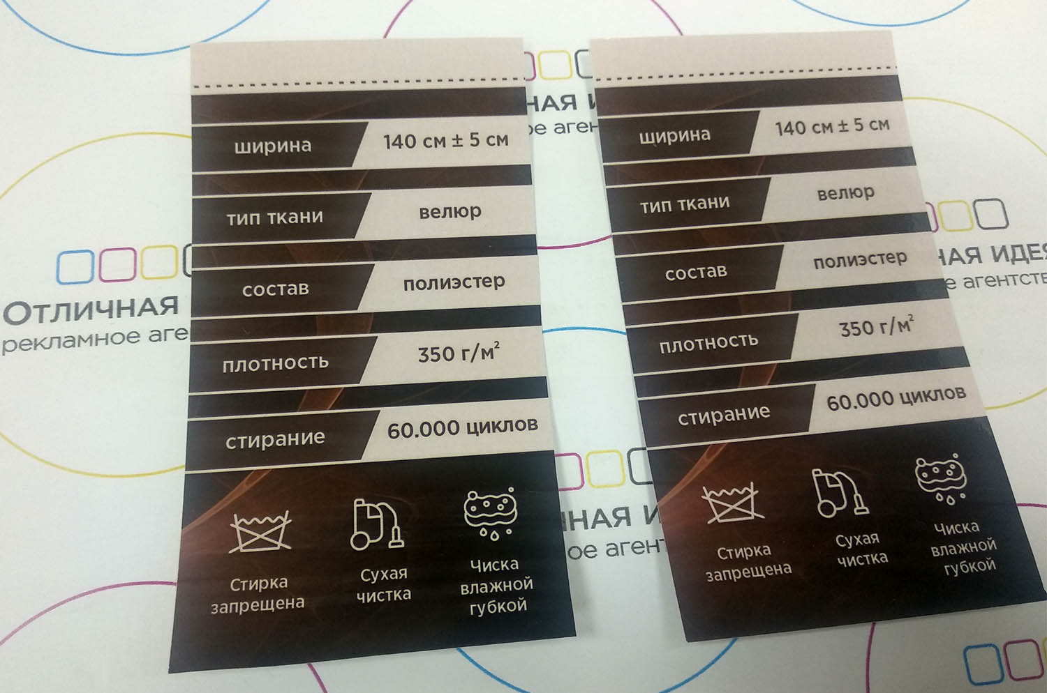 Размер этикетки 11х6, ламинированы. По штриховой линии производится прошивка к ткани, такие этикетки пришиваются к рулонам ткани, к мебели, при использовании, такой ткани.|