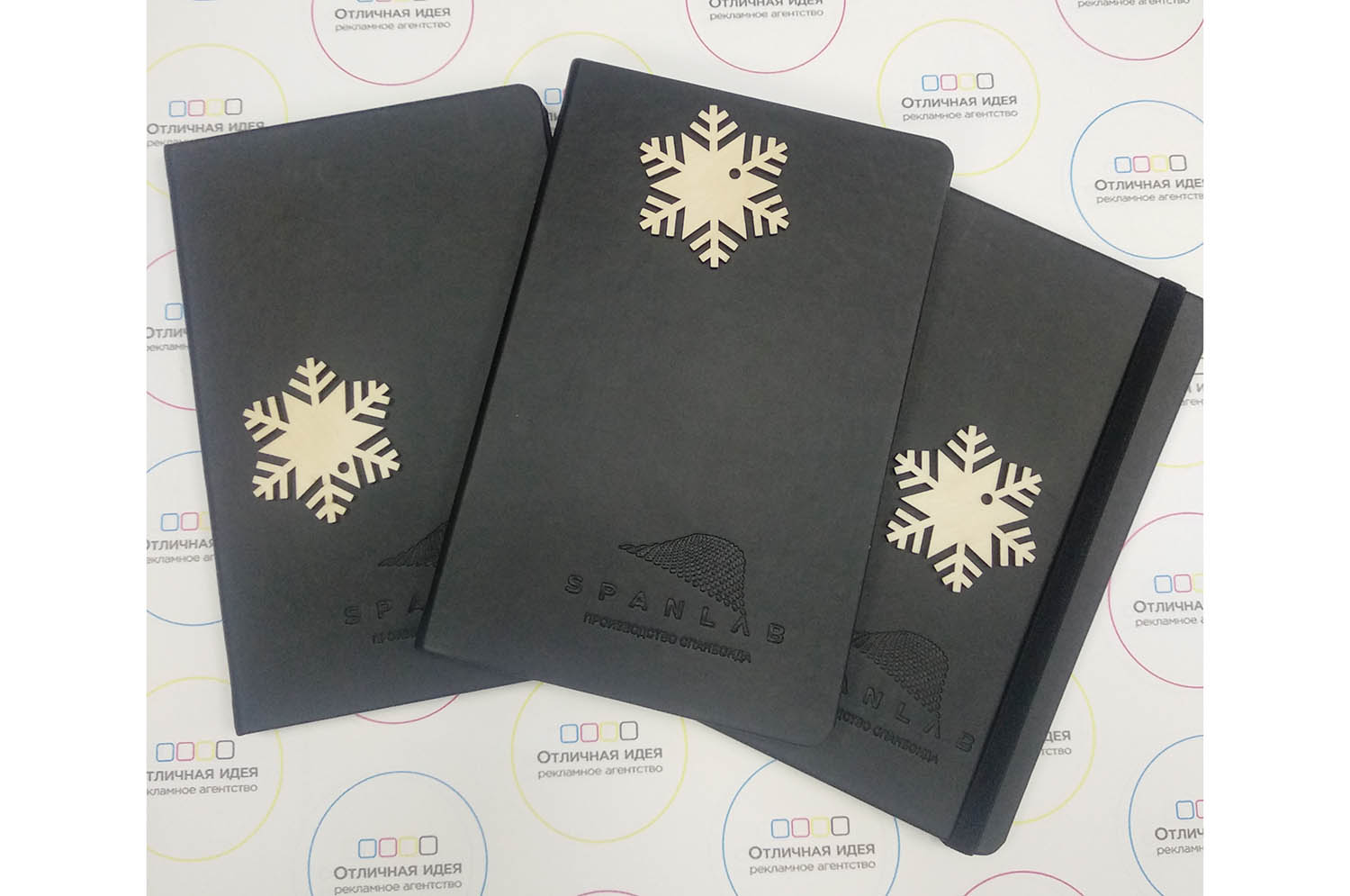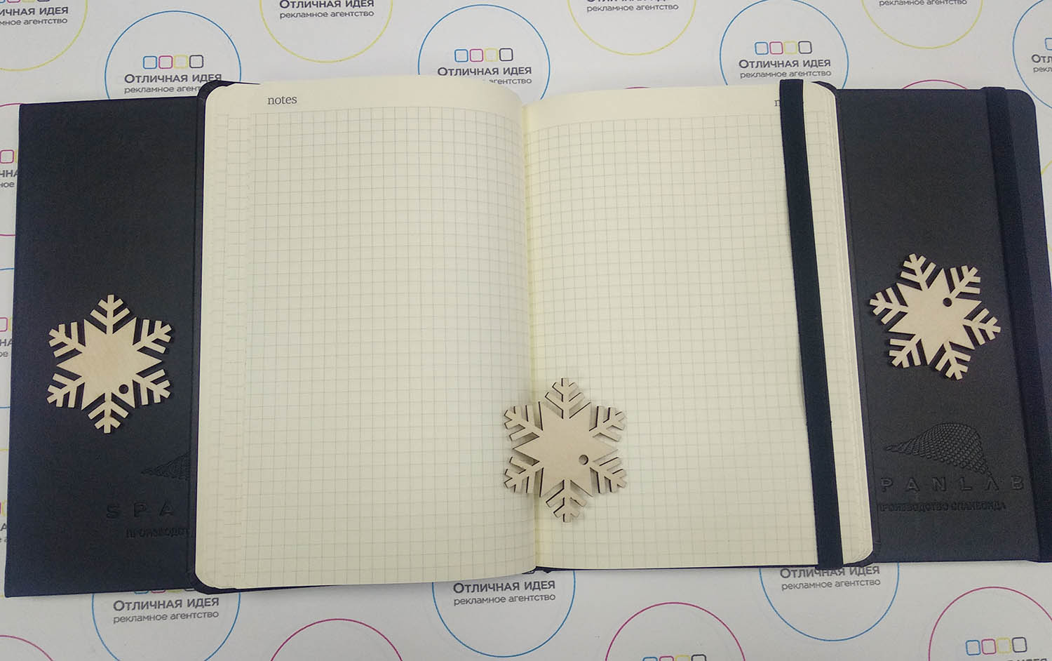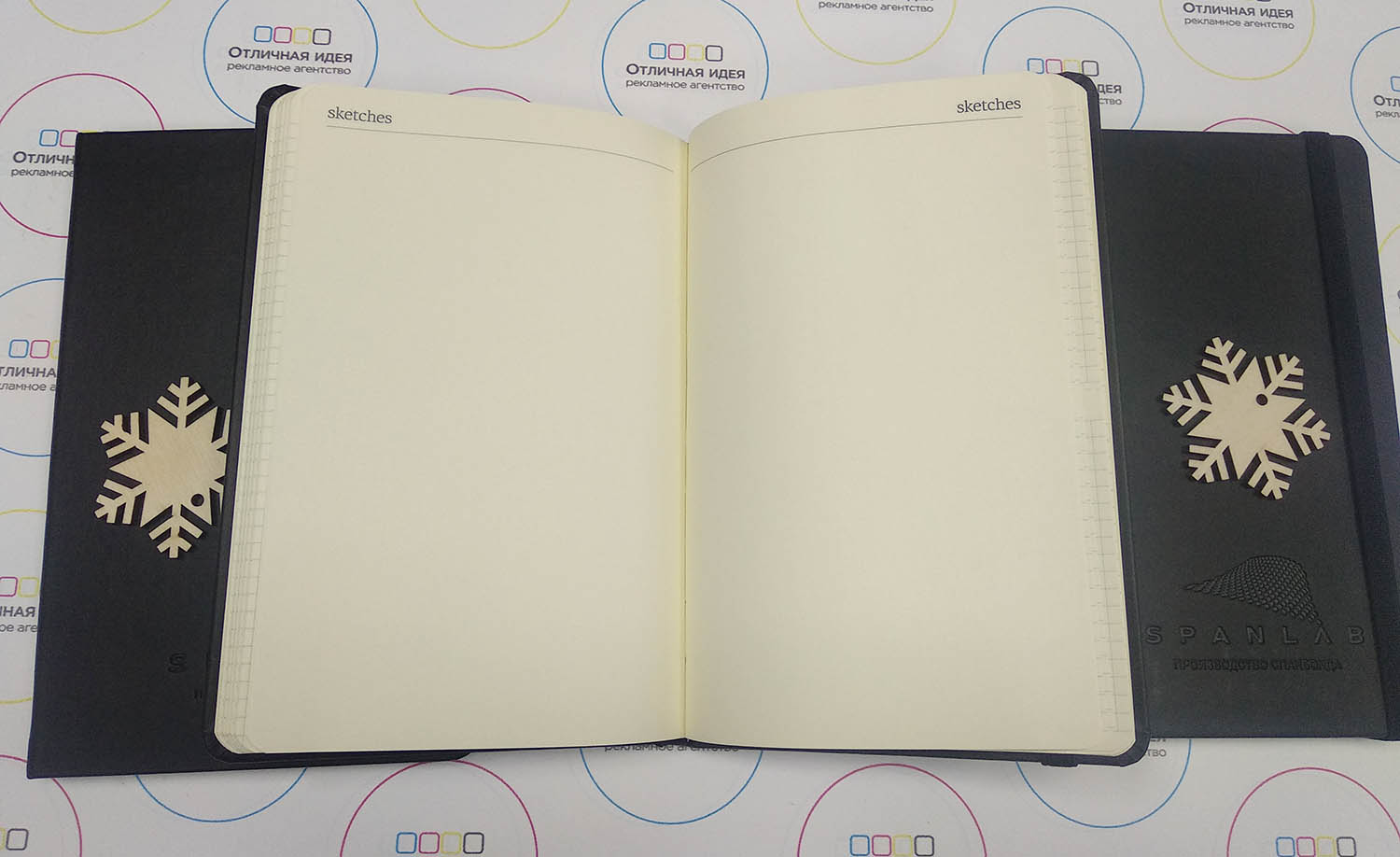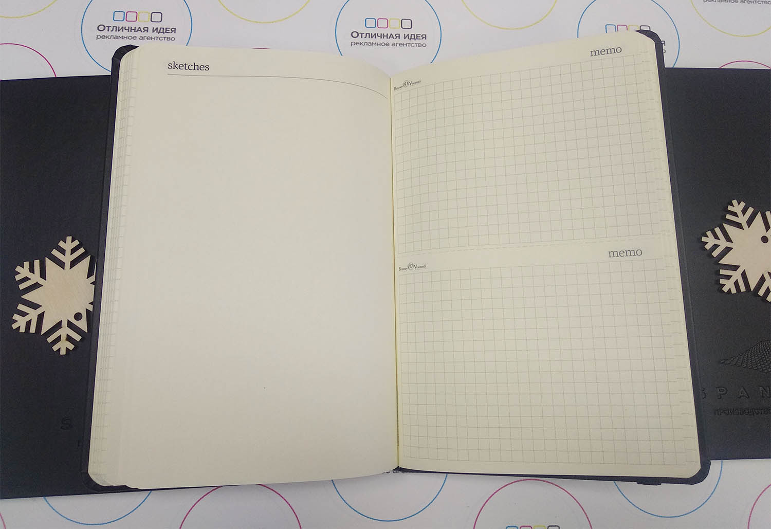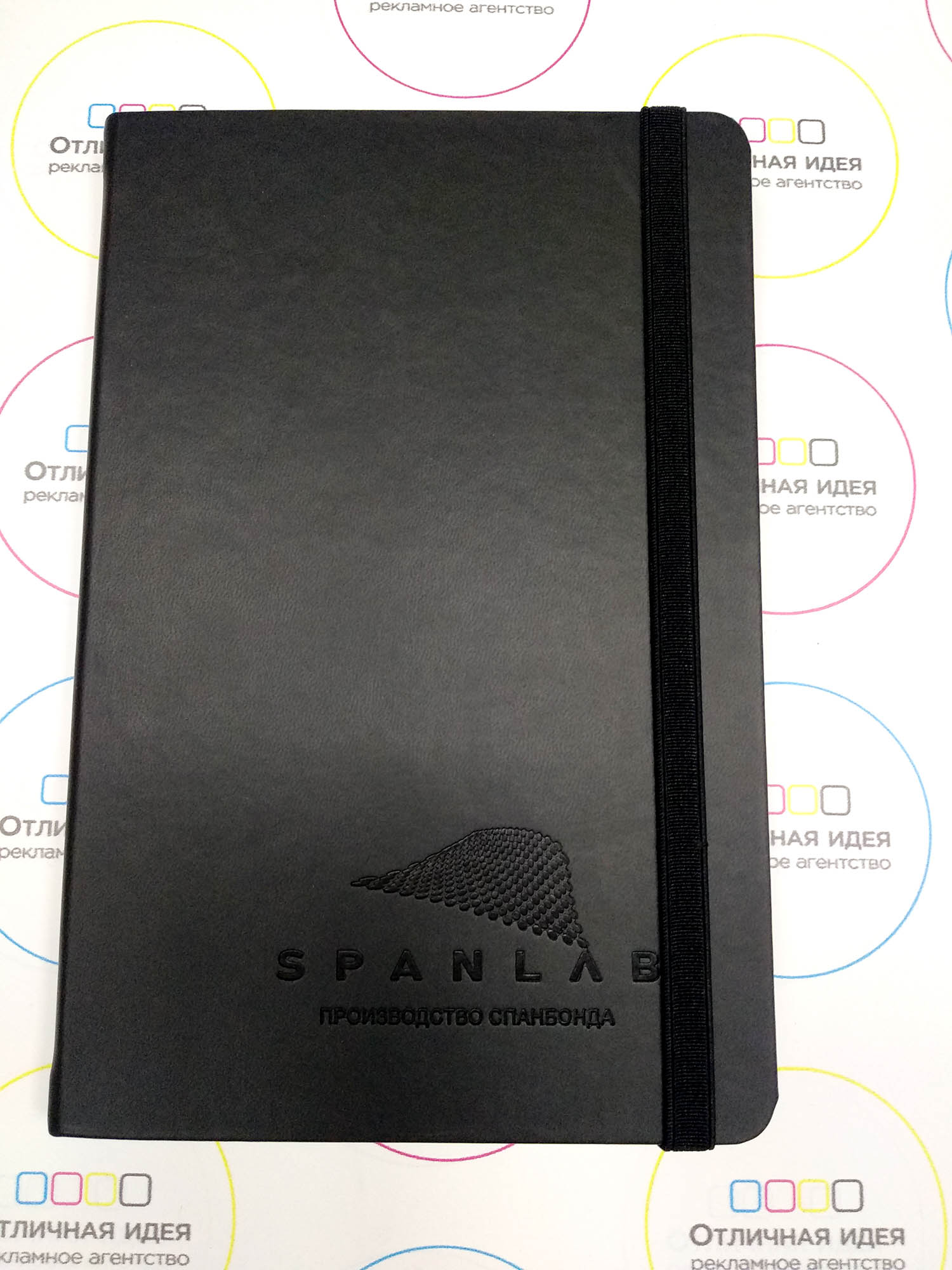 Ежедневник для компании "SPANLAB" размером 14,5Х21, имеется резинка для фиксации страниц в качестве закладки.Планер разделён на две части, первая это листы в клетку, вторая чистые листы. Логотип выполнен с помощью блинтового тиснения.