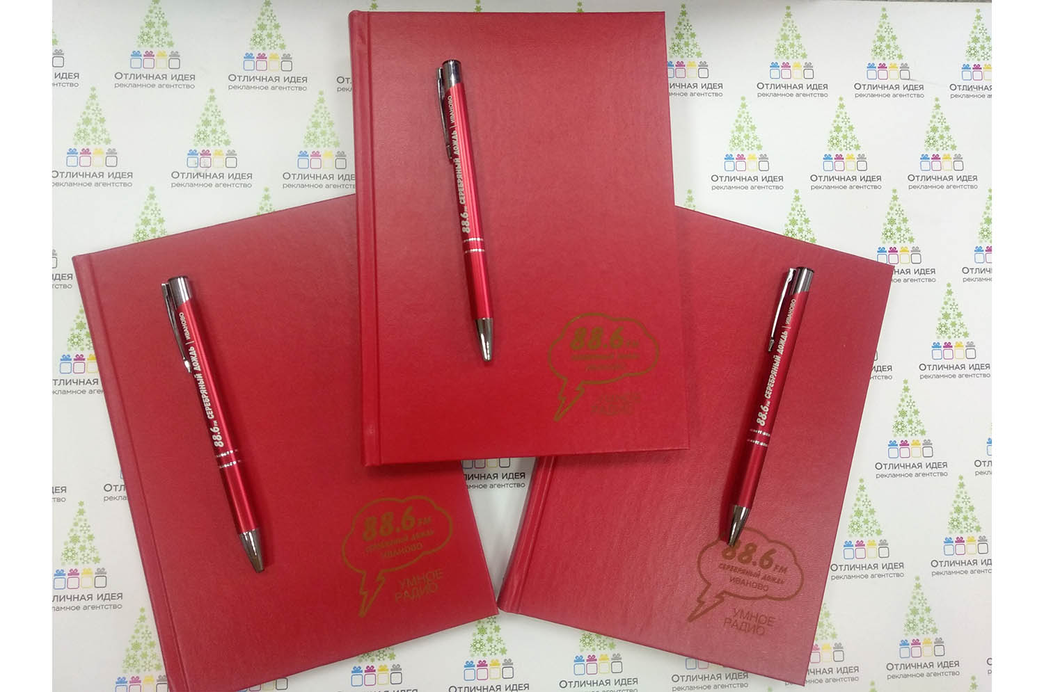 Ежедневник недатированный, логотип выполнен с помощью лазерной гравировки.В комплект, к этому нужному, офисному атрибуту была сделана ручка, логотип которой выполнен с помощью УФ-печати. Комплект смотрится гармонично для подарка как сотрудникам, так и руководителям.