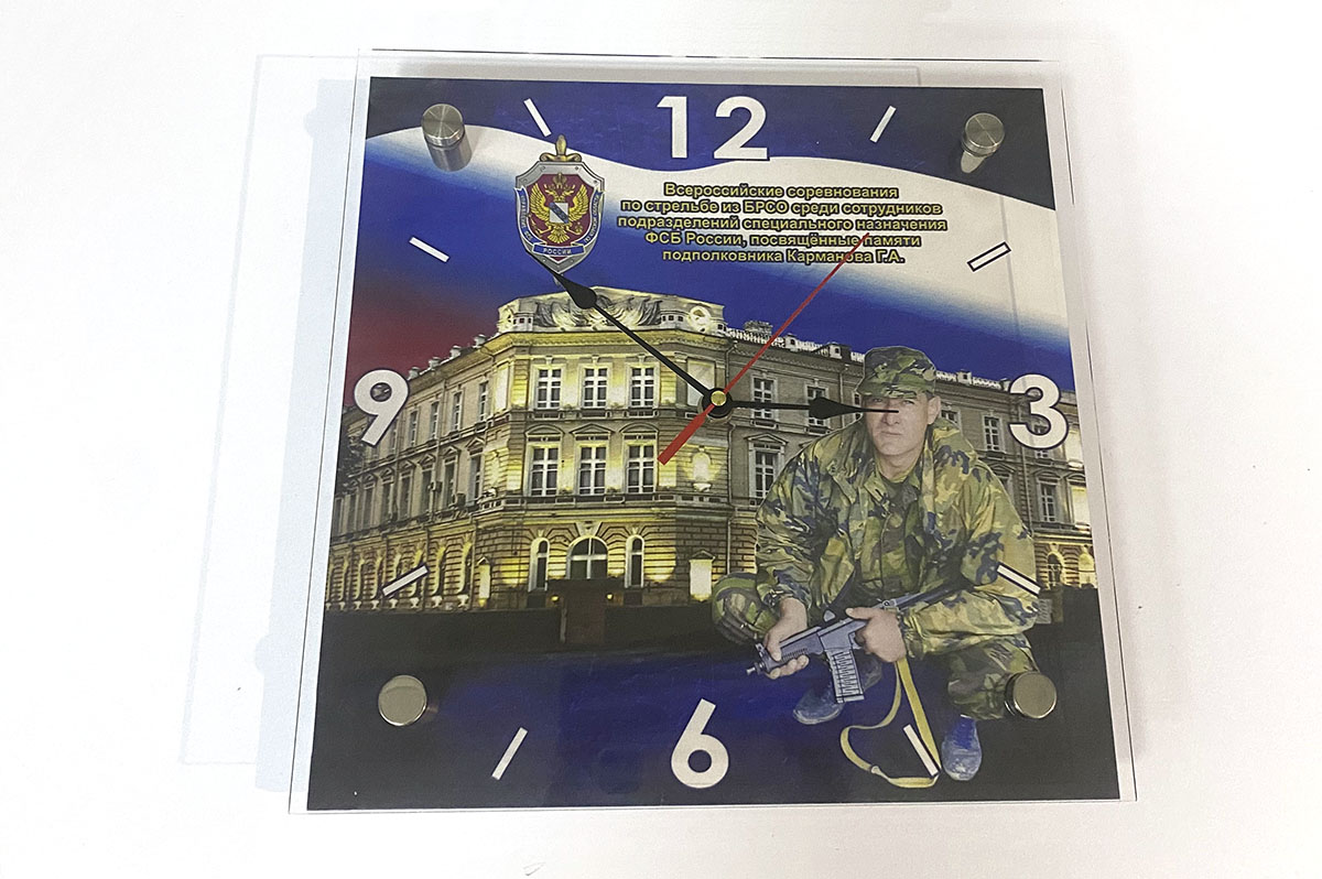 Представленные часы крепятся к стене на дистанционных держателях, имеют покрытие из прозрачного оргстекла толщиной 5 мм.