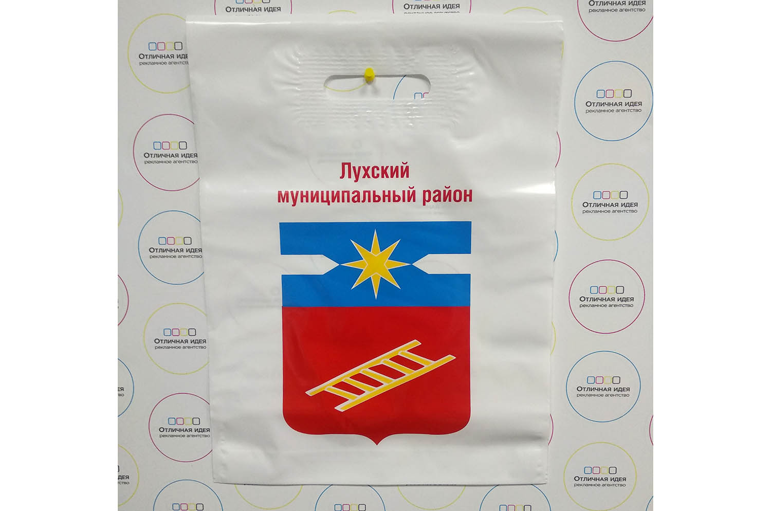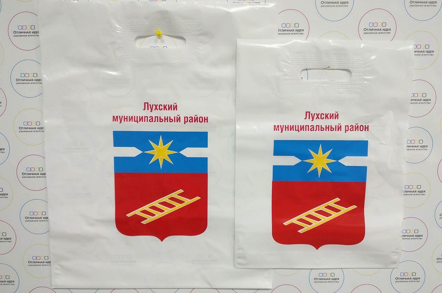 Пакет из полиэтилена, логотип выполнен полноцветной печатью.Укреплённые ручки. Размеры 50х70 и 30х40.