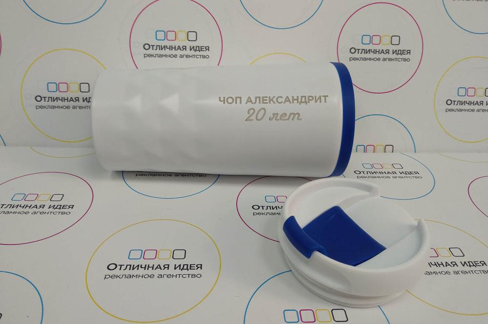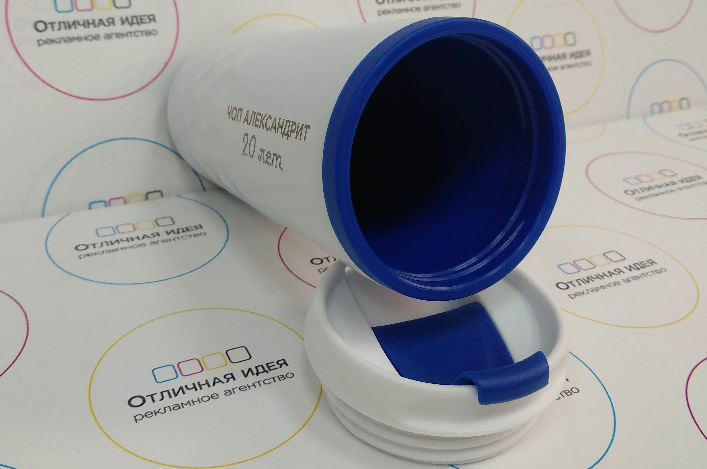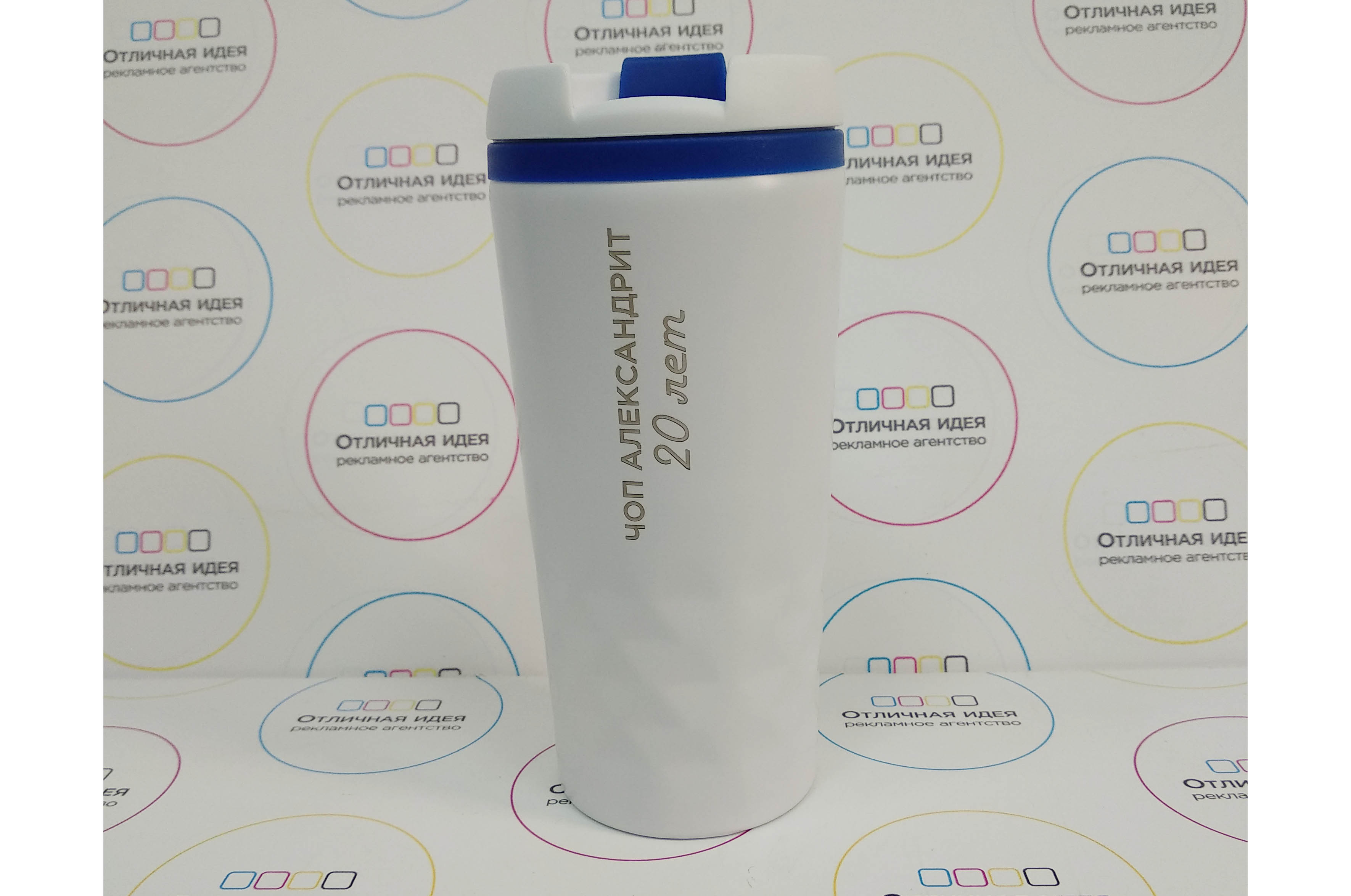 Термостакан выполнен из пластика, оснащен клапаном для удобного использования, логотип нанесён с помощь, УФ-печати.Брендирование такой нужной вещи, для занятых и деловых людей это прекрасный вариант продвижения компании на рынок и формирования положительного имиджа.